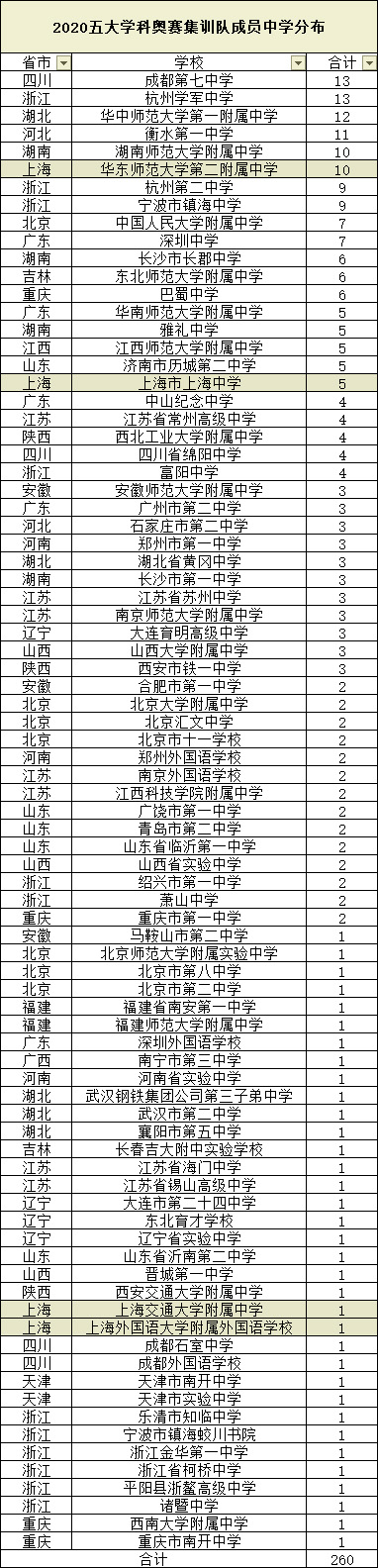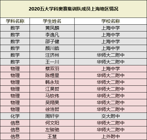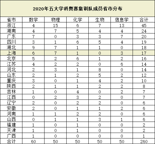 近期,中国科协青少年科技中心发布 2020 年五大学科奥赛国家集训队名单,今年获得保送资格的 260 人名单最终出炉,浙江45、湖南24、广东20位列名单前三名。上海地区共17位学生入选了2020年五大学科奥赛集训队。