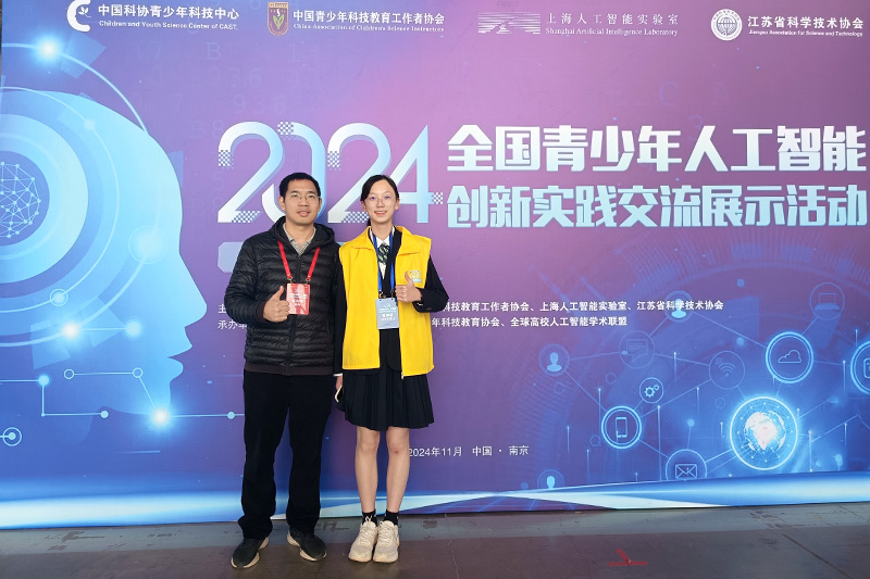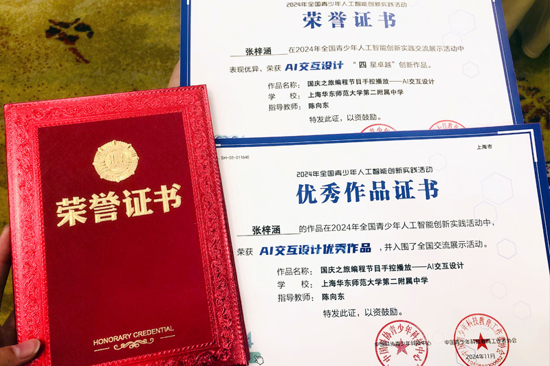 由中国科协青少年科技中心、中国青少年科技教育工作者协会、上海人工智能实验室和江苏省科学技术协会主办的2024年全国青少年人工智能创新实践交流展示活动于11月22-24日在江苏南京举行。我校高一国际课程班张梓涵同学的AI交互设计作品《国庆之旅编程节目手控播放》顺利入选,并在现场任务挑战和作品交流展评环节中表现优异,荣获AI交互设计“四星卓越”创新作品。